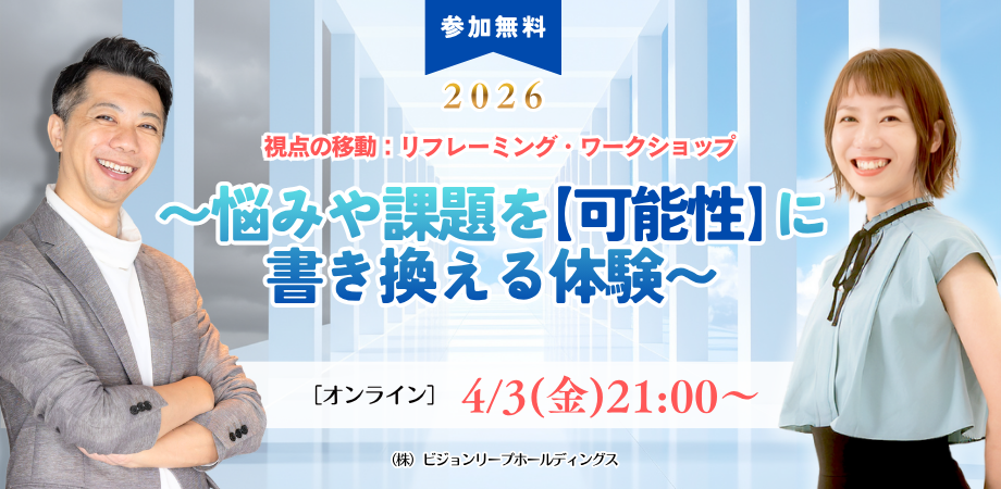 4月 3 @ 9:00 PM - 10:30 PM 【参加無料オンラインワークショップ】視点の移動:リフレーミング・ワークショップ 〜悩みや課題を【可能性】に書き換える体験〜 ■ 「ポジティブに考えよう」…そう言われて、納得できていますか? 一般的にリフレーミングと言うと、 「短所を長 […]